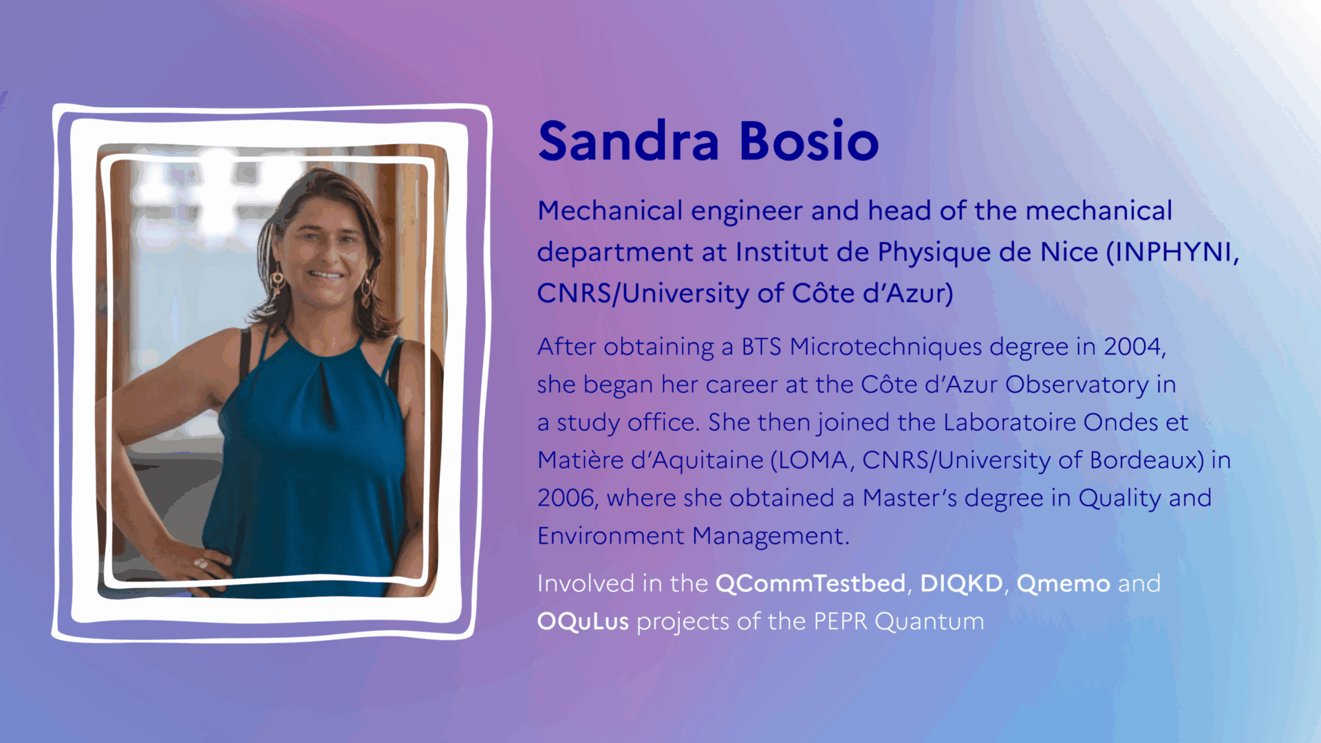 Sandra Bosio is a CNRS mechanical design engineer and head of the mechanical department at the Nice Institute of Physics (INPHYNI). Her role is to bridge the gap between scientific intent and its mechanical implementation, by providing technical support for research. She and her team work closely with researchers to translate what is often highly theoretical research needs into reliable and innovative technical solutions, prototypes and experimental devices. She collaborates in particular with the Photonics and Quantum Information team, which works on topics such as quantum cryptography and metrology. Within this framework, she has participated in the design and production of several parts and prototypes, such as a quantum memory cryostat for storing quantum information.