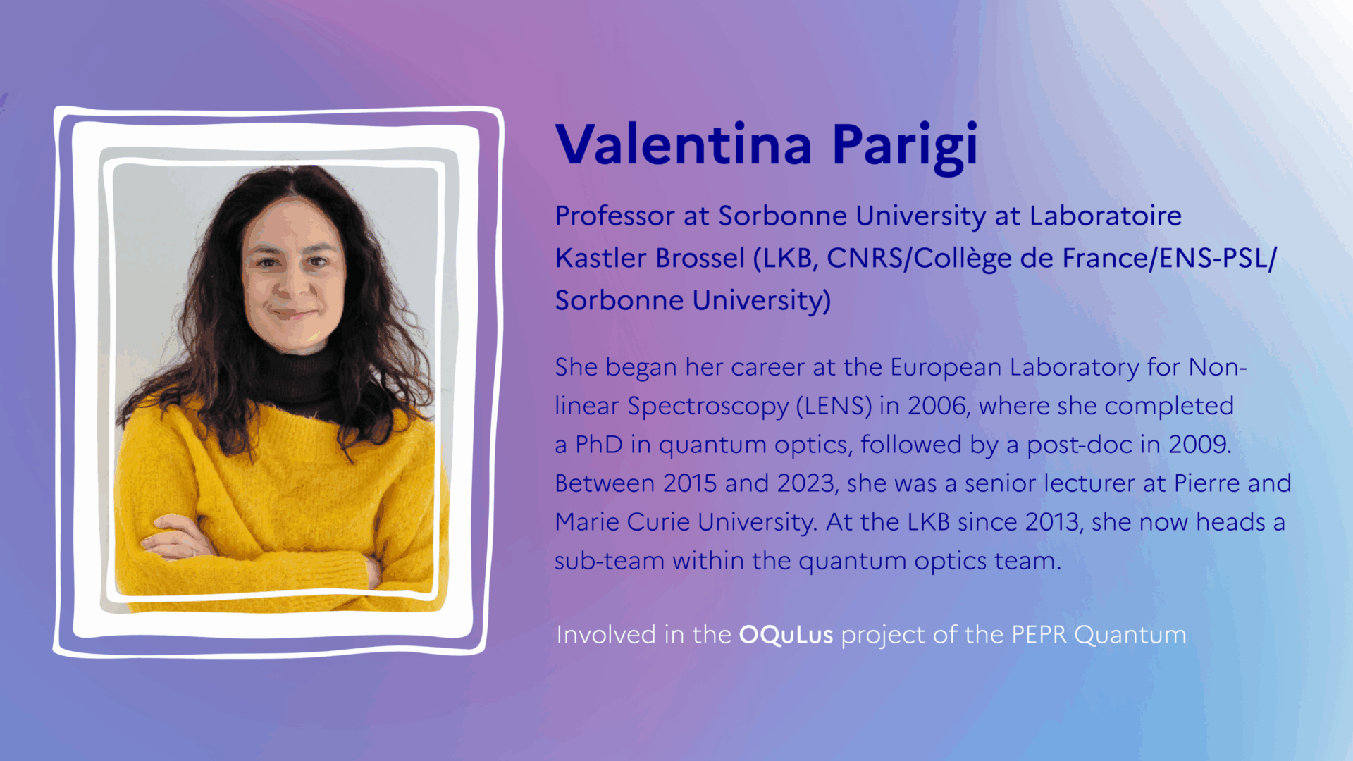 Valentina Parigi is a professor at Sorbonne University and works at the Kastler Brossel Laboratory (LKB). She is part of the PEPR OQuLus project, which aims to develop two different prototypes of photonic quantum computers—one based on discrete variables and the other on continuous variables. Her applied research focuses on the latter.