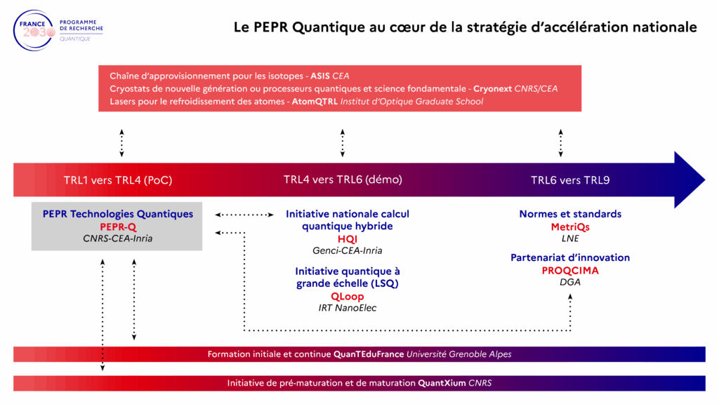 Le PEPR Quantique est le tout premier dispositif à avoir été mis en place dans le cadre de la stratégie et se trouve au cœur de celle-ci. Il cherche en outre à garantir des interactions fortes et continues avec les autres programmes plus aval ou relevant de technologies habilitantes.